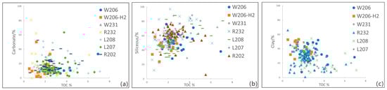 Relationship between TOC and mineral contents in the Wufeng Formation–Long1-1 Sub-member, Neijiang–Rongchang Block. (a) Correlation Plot of TOC Content and Carbonate Mineral Content; (b) Correlation Plot of TOC Content and Siliceous Mineral Content; (c) Correlation Plot of TOC Content and Clay Mineral Content.