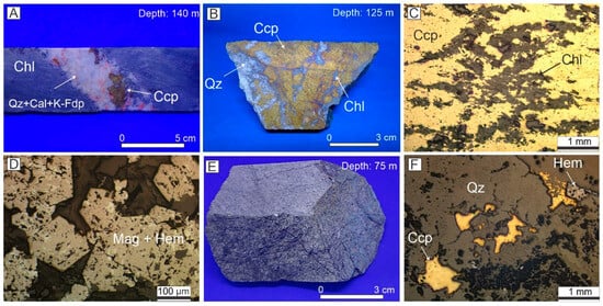 The bedrocks of the investigated boreholes consist of foliated chloritites, found between depths of 35 to 43 m and 70 to 150 m. These chloritites are composed of approximately 80% chlorite, 15% plagioclase, and 5% quartz, with accessory magnetite. The chloritites are crosscut by stockwork veins made up of quartz and chalcopyrite, with accessory calcite, apatite, and fluorite (Figure 2A). They are also intersected by massive sulfide veins, which feature a chalcopyrite matrix, embedded in chlorite (Figure 2B,C), along with quartz, calcite, fluorite, and apatite. The 43 to 70 m interval is dominated by granodiorites, which contain about 40% quartz, 35% oligoclase, 15% orthoclase, and accessory biotite and hornblende (Figure 2D). The granodiorites exhibit extensive chloritization along a network of chlorite veinlets, with disseminated chalcopyrite (Figure 2E).