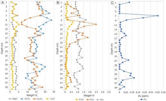 Vertical distribution of selected major elements in the saprolite of drill hole A118-505: (A) MgO, Al2O3, Fe2O3, CuO; (B) P2O5, K2O, TiO2; Au (C).