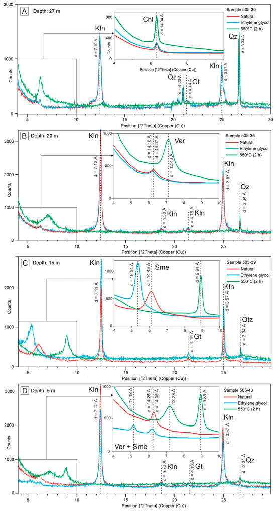 X-ray diffractograms of selected fine saprolite samples (drill hole A118-505) collected at different depths: 27 m (A), 20 m (B), 15 m (C), and 5 m (D). Air-dried (red), ethylene glycol solvated (blue), and heated at 550°C (green) oriented clay mounts. Abbreviations: Kln (kaolinite), Chl (chlorite), Ver (vermiculite), Sme (smectite), Gt (goethite), Qz (quartz).
