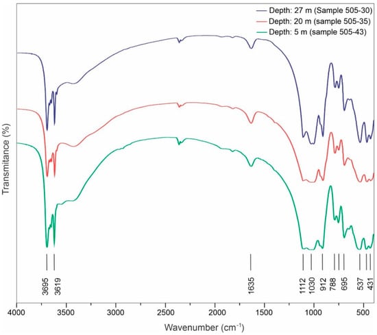 The mid-infrared transmittance spectra (Figure 7) exhibit a typical kaolinite pattern across all analyzed samples, with absorbance values consistent with those reported by [33,34]. The absorption bands at 431, 468, and 537 cm−1 are attributed to the Si-O, Si-O-Si, and Al-O-Si deformation vibrations, respectively. The bands at 695, 753, and 788 cm−1 correspond to the Si-O bond, with the first two bands being of the perpendicular type. The band at 912 cm−1 represents the deformation of internal hydroxyl groups. The Si-O stretching vibrations are observed at 1030 cm−1 and 1112 cm−1, parallel and perpendicular to the bond, respectively. The band at 1635 cm−1 indicates the OH deformation vibration of water. The bands at 3619 and 3695 cm−1 are related to the stretching vibrations of internal hydroxyl groups. No absorption bands typically associated with smectites, such as the 3420 cm−1 band, indicative of water molecules, were detected. Therefore, the FTIR spectrum confirms the dominance of kaolinite among clay minerals.