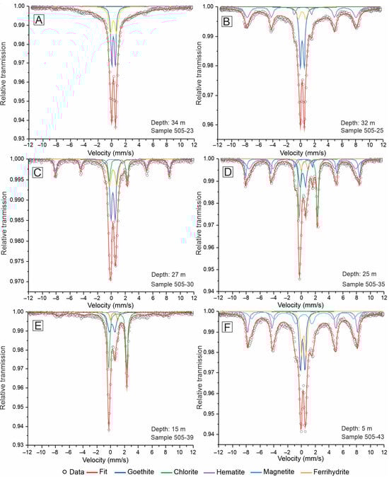 Mössbauer spectra of selected samples from the coarse saprolite (A,B) and fine saprolite (C–F) taken at room temperature (drill hole A118-505). Solid colored lines are the best fits, and black dots indicate the experimental data.