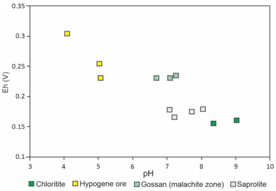 Conversely, new formation of gossan minerals and hydrolysis of chlorites from the host rocks results in the consumption of H+, with pH elevation. The malachite predominance in gossan samples accounts for the more alkaline values [69,70,71]. Chlorites from the host rocks and kaolinite from the saprolite tend to consume H+ during hydrolysis reactions, leading to higher pH values [67]. These data demonstrate a minor effect of hypogene mineralization on the pH and Eh conditions of the saprolite.