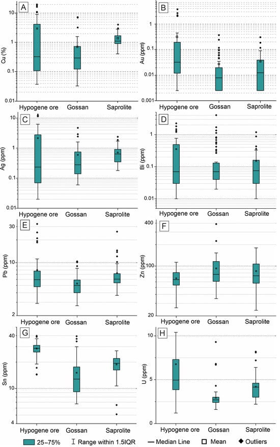 Geochemical fractionation of selected elements in hypogene mineralization, gossan, and saprolite from drill hole A118-505: Cu (A), Au (B), Ag (C), Bi (D), Pb (E), Zn (F), Sn (G), and U (H). Sample size: hypogene mineralization (n = 44); gossan (n = 62); saprolite (n = 40).