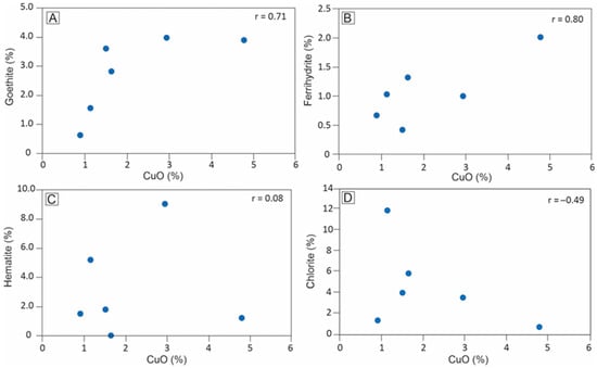Distribution of CuO (wt.%) versus potential Cu mineral sink in the Alvo 118 saprolite (drill hole A118-505): CuO × goethite (A); CuO × ferrihydrite (B); CuO × hematite (C); CuO × chlorite (D). CuO contents were determined through ICP-AES analysis of whole samples of the saprolite.