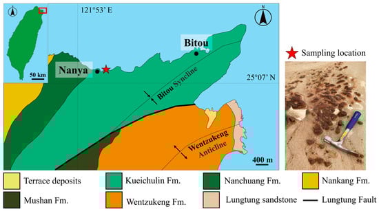 The concretion sample analyzed in this study was collected from the coastal area of Nanya, located in the northeastern region of Taiwan (Figure 1). This area is part of the Pliocene Kueichulin Formation (6.5–4 Ma), which consists of thick interbedded sequences of sandstone, argillaceous sandstone, and shale. These sediments were deposited in wave- and tide-dominated shallow marine to deltaic environments [17,18,19]. Based on lithological characteristics, the lower portion of the Kueichulin Formation is also referred to as the Tapu Formation. This unit is characterized by thick-bedded, dark yellowish sandstone and greyish, fine-grained argillaceous sandstone interbedded with shale layers [17]. Marine fossils, including Ditrupa species, are commonly found in this interval. The top boundary of the Tapu Formation is notably enriched with ferric oxide concretions, from which the sample used in this study was obtained [17,20]. The upper portion of the Kueichulin Formation is known as the Erchiu Formation. It is composed primarily of interbedded, thick, greenish-grey argillaceous sandstone and siltstone, along with shale [17]. Subsequent tectonic activity during the Pleistocene, driven by the subduction of the Philippine Sea Plate beneath the Ryukyu arc, resulted in the folding of the Kueichulin Formation and overlying strata into the Bitou Syncline and the Wentzukeng Anticline [18].