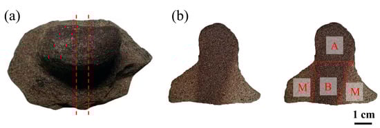 The concretion sample was sectioned along a profile shown in Figure 2a, and the middle portion (Figure 2b) was extracted and polished with progressively finer sandpaper and ultrasonically cleaned to remove any residual particles throughout each step before analysis. The central portion of the concretion was further subdivided into three distinct regions for analysis: (1) Region A, the rim, representing the exposed and protruding outer part; (2) Region B, the core, representing the internal, non-exposed portion; and (3) the surrounding matrix (Region M), which borders both sides of the concretion (Figure 2b). Micro-Raman spectroscopy was employed to characterize the mineral composition of these three regions.