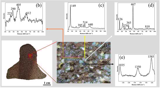 Typical microscopic structure (a) of the sample and Raman spectra of different grain materials of material of each colour. (b) Brown matrix; (c) yellow coating of white grain; (d) white grain; (e) dark grey grain.