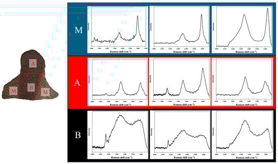 Typical Raman spectra of different concretion domains (M: matrix; A: rim; B: core). D3 band is attributed to out-of-plane vibrations due to defects and heteroatoms.