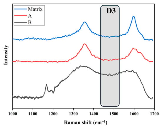The absence of discernible Raman bands in the second-order region (3500–2400 cm−1) suggests that kerogen in this sample has undergone only diagenesis and not metamorphism [13]. Furthermore, the D3 band (~1500 cm−1), typically associated with out-of-plane vibrations due to defects and heteroatoms, is absent in the kerogen from the rim (A) and the matrix (M). Its presence only in the core (B) suggests a lower degree of diagenetic alteration, as the D3 band tends to disappear progressively with increasing diagenesis or graphitization [13,16]. This observation supports the interpretation that the kerogen in the core retains a higher proportion of original organic material than that in the rim and matrix.