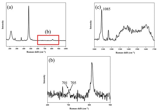 Measurements were conducted using a Micro-RAM300 micro-Raman spectrometer (Lambda Vision, Sagamihara, Japan). The excitation wavelength was set to 532 nm, and a 20×/0.45 objective lens (Nikon, Tokyo, Japan) was used. Laser power was adjusted depending on the specific component being analyzed. The exposure time ranged from 5 to 10 s, with 5 to 10 accumulations per measurement. A diffraction grating of 1800 grooves/mm was used. All spectral data were processed using OriginPro 2022, including baseline correction and spectral smoothing as necessary.