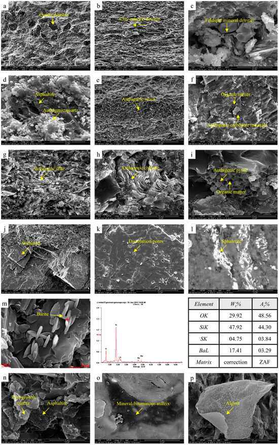 Inorganic minerals and organic matter in the Niutitang Formation shale of the Cengong Block. (a) Quartz detritus, dispersed within argillaceous material, with underdeveloped intergranular pores. Well TXA, 1590.12–1590.22 m; (b) clay mineral detritus, predominantly illite, with clear bedding and bedding-parallel fissures. Well TXA, 1581.05–1581.15 m; (c) feldspar mineral detritus showing detrital feldspar and its alteration. Well TXA, 1804.81–1805.09 m; (d) authigenic quartz coexisting with asphaltite and exhibiting euhedral crystals and crystallites. Well TXA, 1775.56–1775.78 m; (e) authigenic silica, with siliceous bands distributed along the bedding. Well TMA, 1475.50–1475.55 m; (f) authigenic carbonate minerals coexisting with calcite and organic matter and showing a small amount of dissolution pores. Well TMA, 1450.37–1450.62 m; (g) authigenic illite resulting from the alteration of mica. Well TXA, 1804.81–1805.09 m; (h) authigenic chlorite, flaky in form. Well TMA, 1475.50–1475.55 m; (i) authigenic pyrit, with organic matter filling the intercrystalline pores of pyrite. Well TXA, 1788.57–1788.85 m; (j) witherite, rhombic in shape, with a stepped fracture surface and well-developed dissolution pores. Well TXA, 1813.70–1813.72 m; (k) magnified view of Figure 2j showing witherite and its dissolution pores. Well TXA, 1813.70–1813.72 m; (l) sphalerite, distributed in bands along bedding, with a Zn content of 63.00%. Well TXA, 1817.14–1817.49 m; (m) energy spectrum analysis of the hydrothermal mineral, Well TMA, 1445.18–1445.47 m, barite with a Ba content of 17.41% coexisting with silica; (n) asphaltite, Well TXA, 1788.57–1788.85 m, asphaltite with no fixed shape where the asphaltenes are tightly coeval with nanoscale post-growth quartz; (o) mineral–bituminous matrix, Well TXA, 1581.05–1581.15 m, asphaltite encapsulating minerals and an argon-ion polished surface; (p) alginit, Well TXA, 1560.92–1561.02 m, with clear surface ornamentation.