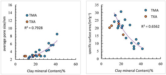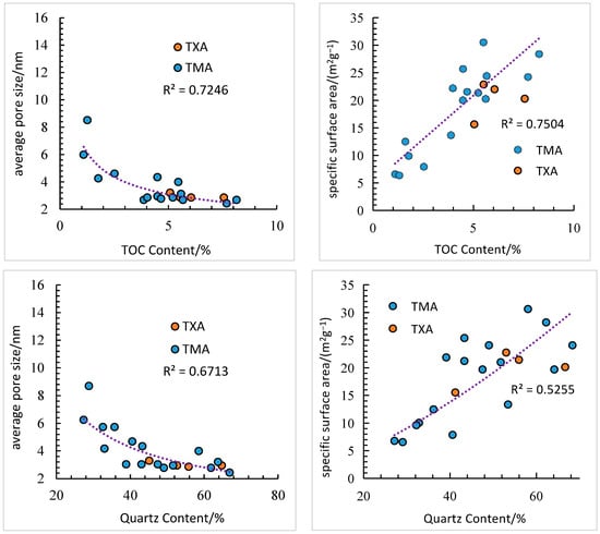 The average pore size in the reservoir of shale in the Niutitang Formation exhibits a significant relationship with mineral composition and organic matter content (Figure 3). The average pore size shows a strong exponential correlation with the TOC content [33]. The TOC content primarily influences micropores and mesopores below 5 nm. A substantial number of mesopores and micropores exist within the organic matter, which is favorable for natural gas storage. Since the organic matter content in the shale of the Niutitang Formation is closely related to quartz content, the average pore size exhibits a similar exponential relationship with quartz content, with a clear correlation. The clay mineral content is positively correlated with the average pore size [34]. The intercrystalline pores between clay minerals are mainly mesopores ranging from 2 to 8 nm, which can adsorb a portion of natural gas [35]. The TOC content in the shale of the Niutitang Formation is well-correlated with specific surface area. Asphaltite contains numerous spherulites, and the film-like, interwoven, and detrital organic matter covering mineral surfaces increases the specific surface area. Quartz is less affected by compaction due to its high hardness [36]. Thus, it shows a positive correlation with the specific surface area. The specific surface area is negatively correlated with the clay content, indicating strong compaction effects.