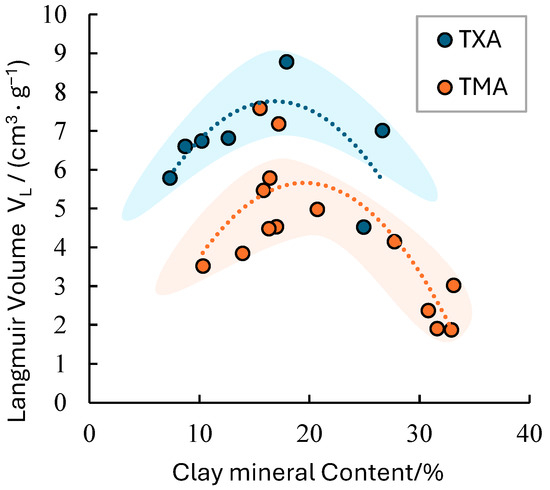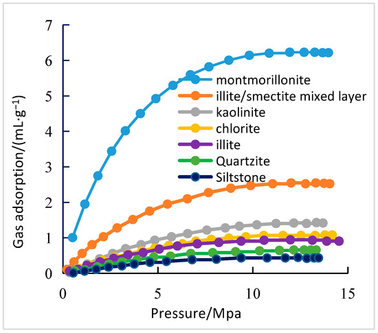 Effect of mineral composition and organic matter on adsorbed gas: The adsorption capacity of shale is influenced by its pore structure [38]. The pore structure is governed by the mineral composition within shale [20]. Given that clay minerals possess a high volume of micropores and a substantial specific surface area, their contribution to the shale’s adsorption capacity is significant [39]. The adsorption capacity of clay minerals ranks as follows: montmorillonite > mixed layer illite/smectite > kaolinite > chlorite > illite (Figure 4) [27]. The total amount of clay minerals in the shale of the Niutitang Formation and the natural gas adsorption capacity initially increase and then decrease (Figure 5). Micropores in clay minerals have a strong capacity for adsorbing natural gas, hence a small amount of clay can enhance adsorption capacity [40]. However, an excessive clay content (clay content > 35%) reduces the TOC content of shale (Figure 6), which is a primary controlling factor affecting adsorption capacity (Figure 7).