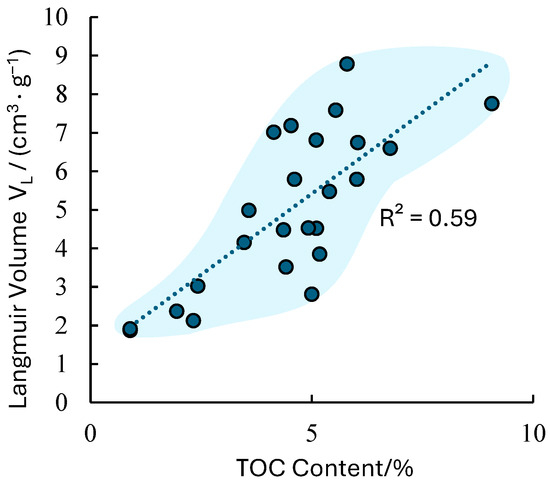Experimental studies by Lu et al. [41] and Kennedy [42] have demonstrated a strong linear positive correlation between the TOC content and methane adsorption capacity. Research and experimental results by Ross [43] and Bustin et al. [44] on Gordondale shale in Canada corroborate these findings, indicating that higher TOC content corresponds to stronger gas adsorption capacity in shale. The higher TOC content in the shale of the Niutitang Formation represents the greater gas adsorption capacity of shale (Figure 7). The organic carbon content is the primary controlling factor for adsorbed gas volume in shale, and the two exhibit a strong positive correlation [28,32].