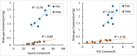 Effect of mineral composition and organic matter on the gas content: Figure 8 shows that the shale gas content exhibits a strong positive correlation with the TOC content. The symbiotic relationship between authigenic quartz and bituminite under scanning electron microscopy indicates that a significant portion of quartz in the shale of the Niutitang Formation is of biogenic origin. Quartz, like organic matter, is derived from siliceous algae and bacteria. Consequently, the shale gas content shows a strong positive correlation with the quartz content [41].