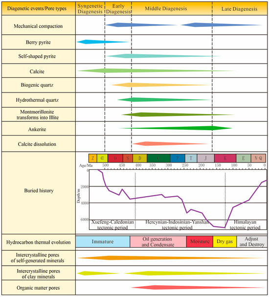 Based on the interrelationships of authigenic minerals observed under scanning electron microscopy as well as the formation conditions and diagenetic characteristics of the minerals, the main diagenetic stages and paragenetic sequences of shale in the Niutitang Formation are analyzed as follows (Figure 9) [22,29].