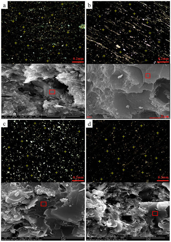 Total organic carbon (TOC) content measurement: The TOC content was measured using a LECO CS-230 carbon-sulfur analyzer (LECO Corporation, St. Joseph, MI, USA). Approximately 0.1 g of each powdered sample was combusted at 950 °C in an oxygen-rich atmosphere, and the released CO2 was measured by infrared absorption. Three measurements per sample were taken, and the average TOC value was reported. Mineral composition analysis by X-Ray diffraction (XRD): The mineral composition was analyzed with a SmartLab 9 X-ray diffractometer (Rigaku Corporation, Tokyo, Japan). Samples were finely ground and clay minerals were separated using a centrifugation method. XRD was performed over a 2θ range of 5° to 70° with a 0.02° step size. The quantitative analysis of minerals such as kaolinite, montmorillonite, and illite was performed by comparing XRD peak intensities with standard reference materials. The Rietveld refinement method was employed to obtain accurate mineralogical quantification. Helium porosity measurement: The helium porosity was measured using an HKC-2 helium porosity meter (Serve Real Instruments, Wuxi, China). The samples were vacuum-dried at 60 °C for 12 h to remove moisture. Total pore volume was determined under helium gas intrusion (pressure: 1 atm, temperature (22 ± 0.5 °C) with three independent measurements per sample (RSD < 1.5%), and the average porosity was reported. Nitrogen adsorption and pore structure analysis: Nitrogen adsorption was conducted using a Quadrasorb SI analyzer (Quantachrome Instruments, Boynton Beach, FL, USA) at liquid nitrogen temperature (−196 °C). The samples were degassed at 150 °C for 6 h under vacuum (<10−4 Pa) prior to analysis. The specific surface area (SSA) was determined using the BET model, with the P/P0 range set between 0.05 and 0.30. Pore size distribution (PSD) and mesopore volume (ranging from 2 to 50 nm) were calculated using the BJH model based on the adsorption branch. Data processing was carried out using the instrument’s MicroActive v3.01 software. Field emission scanning electron microscopy (FE-SEM): (Thermo Fisher Scientific, Waltham, MA, USA) A Quanta 200F FE-SEM was used to observe the microstructure of the shale samples. Samples were sputter-coated with Au/Pt (10 nm thickness, deposition rate: 5 nm/min) to ensure conductivity. Imaging was performed at magnifications of 5000×–20,000× under a high vacuum (<10−6 Torr). FE-SEM allowed for the examination of mineral morphology, pore structures, and the distribution of organic matter at high magnifications. The vitrinite reflectance (Ro) of bitumen was determined, utilizing a photometric microscope system equipped with calibrated oil-immersion objectives (50×) and monochromatic light (λ = 546 nm). Measurements were performed on polished whole-rock samples through point statistical analysis of bitumen particles under reflected light. For thermal maturity evaluation, rock pyrolysis analysis was conducted where 100 mg of crushed sample (<100 mesh) underwent programmed pyrolysis from 300 °C to 600 °C (25 °C/min) under a nitrogen atmosphere, with the S2 peak maximum temperature (Tmax) automatically recorded by flame ionization detection during the hydrocarbon cracking stage.