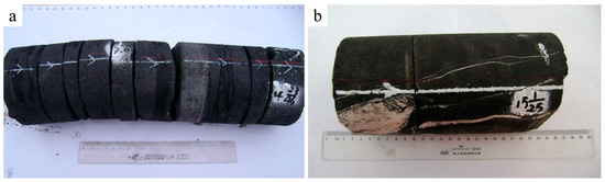 Characteristics of shale fractures in the Niutitang Formation from Well TX1 in the Cenggong block. (a) TX1 Well (1783.8–1789.4 m): development of subhorizontal low-angle fractures with predominantly carbonaceous fillings along bedding planes; (b) TX1 Well (1783.8–1789.4 m): a subvertical high-angle fracture measuring 0.78 m in length, filled with calcite veins.