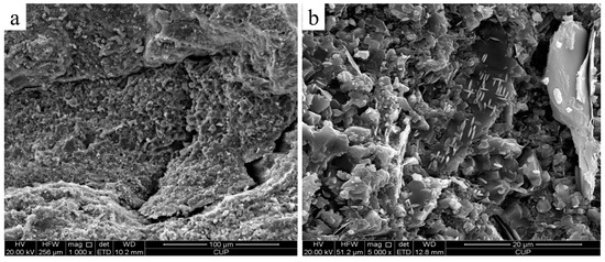 Asphaltite is a degradation product of aquatic lower planktonic algae and bacteria, possessing a strong hydrocarbon-generating capacity. It typically exists in a symbiotic relationship with authigenic minerals. Asphaltite is molded by minerals into irregular shapes or compressed into flat, smooth surfaces (Figure 2n). Furthermore, the mineral–bituminous matrix refers to a mixture derived from the sedimentary–diagenetic stage, which includes primary or contemporaneous finely dispersed organic matter encapsulating nano-sized minerals (Figure 2o). Alginite is defined as the remains of aquatic planktonic lower organisms with unicellular or multicellular biological structures [25]. They are common microfossils [32] and represent one of the significant hydrocarbon source materials. The late Sinian to early Cambrian period witnessed an unprecedented proliferation of microbial and algal organisms. The continuation of this ecological characteristic has led to the widespread development of microbial and algal structures within the lower Paleozoic shales, particularly in the lower Cambrian formation. Scanning electron microscopy at approximately 5000 x magnification allows for the observation of the complete morphology of individual microbial and algal structures, their surface ornamentation, etc., (Figure 2p).