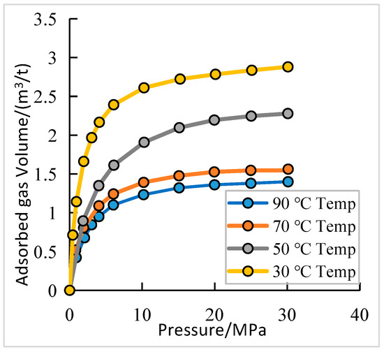 The heat transferred by hydrothermal fluids significantly influences the methane adsorption capacity of shale (Figure 13). That is, an increased formation temperature rapidly decreases the gas adsorption capacity of shale [44]. Research on the geological reserves of shale gas in the upper Jurassic Gordondale Formation in northeastern Canada [43] demonstrates that the methane adsorption capacity depends on the formation temperature. The methane adsorption capacity of shale samples decreases as temperature rises at a constant pressure. The impact of temperature on the adsorbed gas volume in deep shale is quite pronounced (Figure 14). The adsorbed gas volumes of shale are 2.9 and 1.4 m3/t at 30 and 90 °C, respectively.