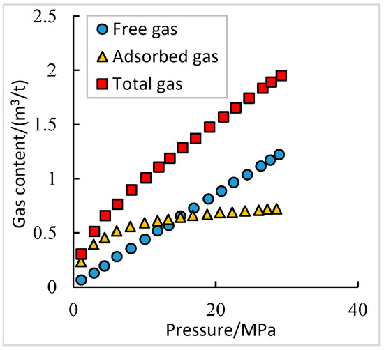 Jiang et al. [48] conducted isothermal adsorption experiments, confirming that the adsorbed gas content in the Niutitang Formation shale in the Sichuan basin increases with rising pressure (Figure 15). It is noteworthy that the adsorbed gas content rises significantly with pressure until a critical value of 0.67 m3/t. The increase rate levels off beyond this critical point (Figure 16). Lu et al. obtained similar results using the Langmuir isothermal adsorption model on Devonian shale in the United States [41].