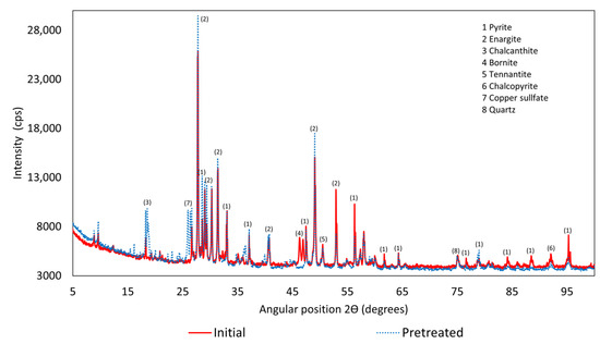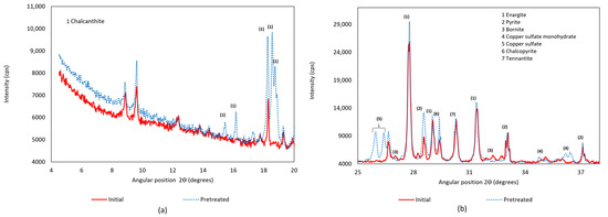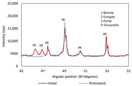 In Figure 3a, a comparison of the X-ray diffractogram between the initial and pretreated concentrate is presented for angular positions between 5° and 20°. Several peaks corresponding to different mineral species are observed. The formation of copper sulfate in the form of chalcanthite is shown by the peaks between 15° and 19°. The formation of copper sulfate is also identified in Figure 3b, where it is evident that copper minerals such as enargite and chalcopyrite do not show significant changes during pretreatment.