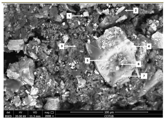 At a scale of 50 µm, copper sulfates can be seen in much of the sample, except on the enargite particles, as shown in Figure 6. According to the X-ray diffraction results (see Section 3.1), the copper species that disappears during the pretreatment is bornite, which suggests it reacted to form copper sulfates. The elemental composition corresponding to Figure 6 is provided in Table 2.