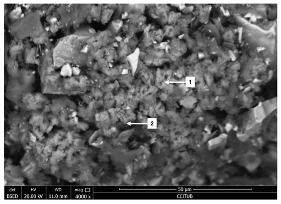 After curing, mineralogical characterization of the sample was carried out using X-ray diffraction (PANalytical X’Pert PRO MPD Alpha1, Malvern, UK) operating from 4.5° to 100° 2 θ with a step size of 0.026° and a time step of 100 s. Sample preparation included back loading of two samples into a standard cylindrical sample holder of 16 mm diameter and 2.5 mm height. Cu K (λ = 1.5418 Ǻ) radiation at 45 kV and 40 mA was used, with a Bragg –Brentano θ/2 θ geometry of 240 mm radius. Masks were used to define a beam length over the sample in the axial direction of 12 mm, Soller slits of 0.04 radians in the incident and diffracted beam, and a fixed divergence slit of 0.25°. The PIXcel detector was configured with an active length of 3.347°. A JEOL J-7100 field emission scanning electron microscope (FESEM, JEOL Ltd., Tokyo, Japan) was also used to detail morphology, and EDS microanalysis was used to determine the semiquantitative elemental composition in three different positions of each sample.