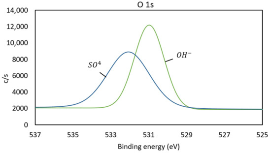 In Figure 8, the O 1s spectrum is shown, where peaks at 531.0 and 532.1 eV are identified. The peak at 531.0 eV is associated with the presence of hydroxides (OH) [21], which could indicate the formation of species such as antlerite. The binding energy at 532.1 eV is associated with oxygen in the form of SO42− [22], which confirms the formation of sulfates on the surface of the pretreated sample.
