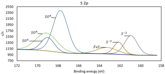 The S 2p spectrum is presented in Figure 9. Peaks are identified at 160.9, 162.1, 163.3, 167.8, 169.0, and 169.2 eV. Covellite (CuS) has an energy for S 2p between 161.9 and 162.9 eV, so the peaks at 160.9 and 162.1 eV are associated with sulfur, likely from a copper sulfide mineral such as CuS [23]. The sulfur at 163.3 eV is associated with Fe-S minerals, such as pyrite, which is identified in the sample through X-ray diffraction and Scanning Electron Microscopy [9]. The high-energy peaks at 167.8, 169.0, and 169.2 eV are associated with the presence of sulfur in sulfates, specifically copper sulfates in this sample [23,24]. Notably, the peak at 169.0 eV is related to antlerite, which is consistent with the O 1s spectrum at an energy of 531.0 eV [24].