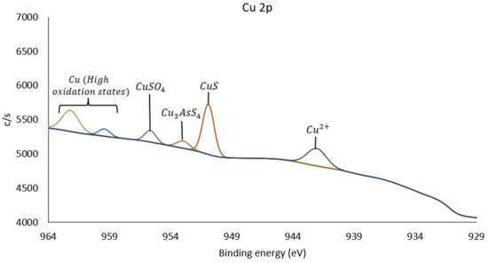 In Figure 10, the spectrum for Cu 2p is presented, where peaks are identified at 942.1, 950.9, 953.0, 955.7, 959.4, and 962.2 eV. The bands found at higher energies correspond to higher oxidation states, indicating that copper in its metallic state is found at lower binding energies, specifically Cu at 932.6 eV. When oxidized, its binding energy increases to 933.7 eV (CuO) [24]. The lowest energy band found in this sample corresponds to the Cu 2p3/2 peak at 942.1 eV, indicating the presence of Cu2+ [9,25]. As oxidation increases in the sample, minerals such as covellite, which has an energy peak at 951.8 eV, can be identified. Therefore, the energy peak at 950.9 eV is associated with a copper species in the form of CuS or something similar. Enargite shows a Cu 2p1/2 peak at 952.0 eV, and tennantite at 952.6 eV, while its S 2p peak is found at 161.8 eV. Thus, the peak at 953.0 eV is associated with a species similar in composition to minerals such as enargite and tennantite [24]. The binding energy of 955.7 eV is associated with copper sulfate, while the signals observed at 959.4 and 962.2 eV correspond to copper species in even higher oxidation states. The specific identification of these species in the literature is limited due to their unusually high binding energies, which may be related to the complexity of the sample resulting from its pretreatment.