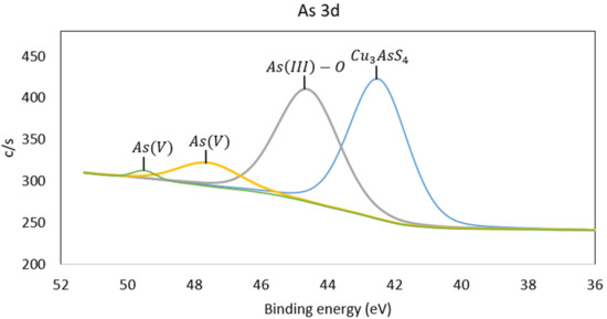 In Figure 11, the As sublevel 3d spectrum is presented. Four peaks can be observed at 42.5, 44.6, 47.6, and 49.5 eV. One of the arsenic peaks in enargite is at 42.6 eV, so the 42.5 eV peak can be related to this mineral due to the amount present in the sample [26]. The 44.6 eV peak corresponds to As(III)-O species [27]. A higher binding energy corresponds to a higher oxidation state of arsenic, such as As2O5, which has an energy peak at 46.2 eV. Therefore, the energy peaks at 47.6 and 49.5 eV are associated with arsenic as As(V) [24].
