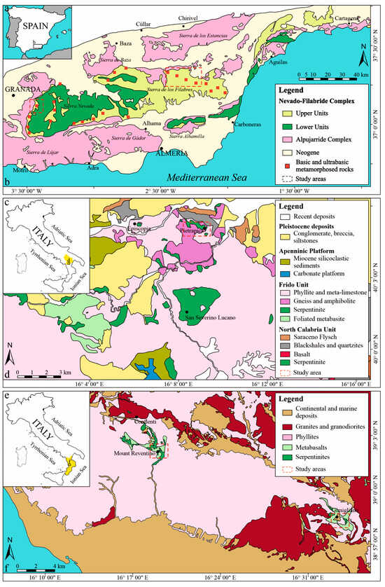 (a) Location in Spain of the investigated areas and (b) simplified geological sketch map with indicated the main outcrops of basic and ultrabasic metamorphosed rocks (modified from [28]); (c) location in Italy of the Basilicata region (yellow) and (d) simplified geological sketch map with locations of the investigated outcrops (modified from [29]); (e) location in Italy of the Calabria region (yellow) and (f) simplified geological sketch map with locations of the investigated outcrops (modified from [30]).