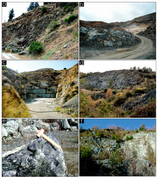 Serpentinite quarries in the investigated localities: (a) Barranco de San Juan (Sierra Nevada–Andalusia, southern Spain); (b) Virgen de Rosario (Sierra de los Filabres–Andalusia, southern Spain); (c) C.E. Verde (Sierra de los Filabres–Andalusia, southern Spain); (d) Pietrapica (Basilicata–southern Italy); (e) Gimigliano (Calabria–southern Italy); (f) Mount Reventino (Calabria–southern Italy).