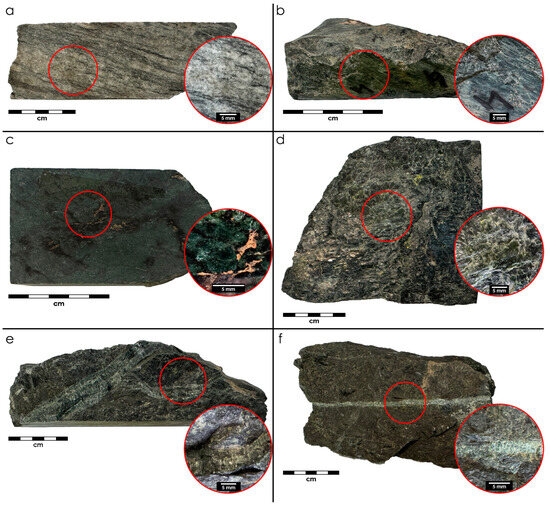 Some examples of serpentinite specimens collected at the quarries, representative of the studied lithotypes: (a–c): Andalusian stones (Spain); (d) Basilicata (Italy); (e,f) Calabria (Italy).
