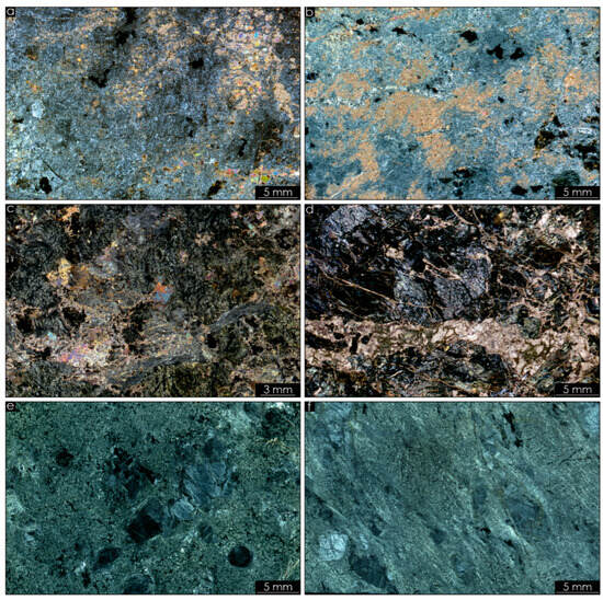 High-resolution thin section optical scans (crossed-polarized light) representative of the petrographic features of the investigated serpentinites: (a) M1 sample (Barranco de San Juan quarry); (b) M4 sample (Virgen de Rosario quarry); (c) S1 sample (Pietrapica quarry); (d) S2 sample (Pietrapica quarry); (e) GIM (Gimigliano quarry); (f) REV (Mount Reventino quarry).