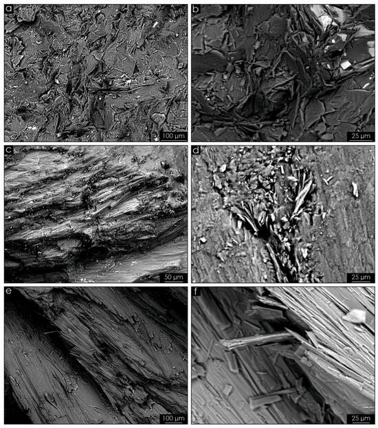 Scanning electron microscope pictures highlighting the occurrence of minerals with fibrous habit within serpentinite rocks: (a,b) microstructural features and different serpentine habits along with Fe-oxides in Andalusian serpentinites; (c) lamellar serpentine polymorphs together with elongated crystals; (d) details of fibrous serpentine polymorphs in Basilicata serpentinites; (e) massive portion from which cleavage fragments are prone to split; and (f) details of the elongated serpentine fibrils occurring in Calabria serpentinites.