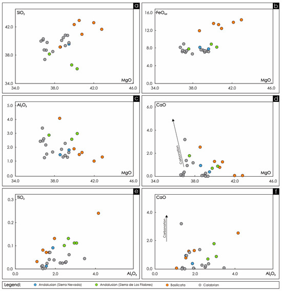 The analysis of the whole-rock chemistry (Figure 8) reveals similar SiO2 contents for the Andalusian (36%–40%) and Calabrian (37%–41%) serpentinites, whereas Basilicata serpentinites show slightly higher values (39%–43%).