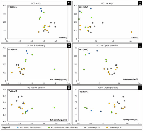 Relationships between different petrophysical parameters measured in serpentinites from Andalusia and Calabria, both before (NCT) and after (PCT) the salt crystallization test. (a) Uniaxial compressive strength (UCS) vs. P-wave velocity (Vp); (b) UCS vs. anisotropy (AVp); (c) UCS vs. bulk density; (d) UCS vs. porosity; (e) Vp vs. bulk density; (f) Vp vs. porosity.