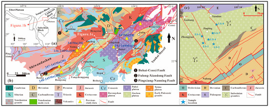 (a) Simplified tectonic map showing major tectonic units in Southeast Asia (modified after [38]). (b) Simplified geological map showing major plutons of Darongshan–Shiwandashan granite belt (modified after [26]). (c) Sketch of a geological map showing sampling locations.