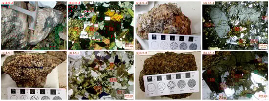 Sample LS-7 was biotite granite and was coarse-grained with a massive texture (Figure 3e). The main minerals were quartz, biotite, and plagioclase. The quartz (30–35 vol%) was irregular with a clean surface. The biotite (10–15 vol%) was dark brown with a size of 200–600 μm. The plagioclase (5–10 vol%) was dark gray with a grain size of 200–500 μm (Figure 3f).