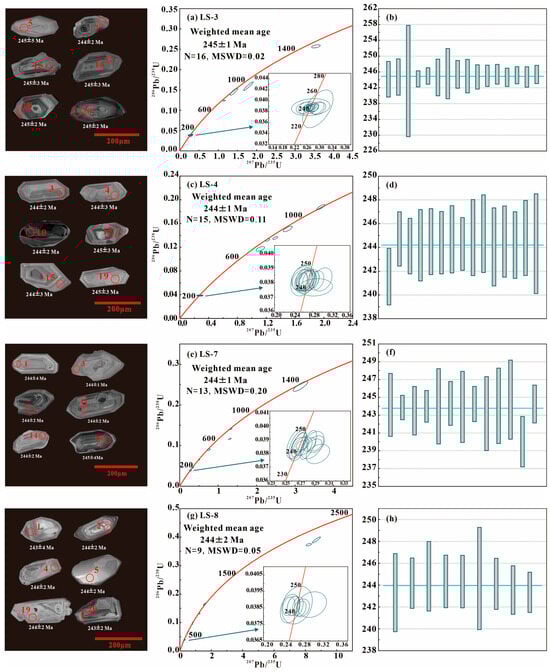 The results showed that twenty zircon grains from sample LS-8 had a U content of 314–1929 ppm and a Th content of 101–939 ppm, with a Th/U ratio of 0.17–1.31 (Table 1). Nine of the grains yielded a weighted average 206Pb/238U age of 244 ± 2 Ma (MSWD = 0.05, 1σ) (Figure 4g,h), representing the crystallization age.
