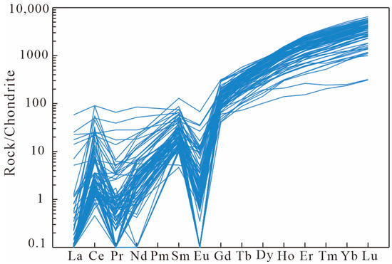 The trace element composition of zircons in granite showed that they were enriched in Th, U, Ta, Pr, and Hf and relatively depleted in Nb, La, Sr, Nd, and Ti. Additionally, they had high contents of heavy rare-earth elements (HREEs) and low contents of light rare-earth elements (LREEs), accompanied by notable negative Eu anomalies (Figure 5, Table 2 and Table 3).