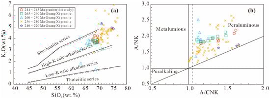 Plots of (a) K2O versus SiO2 and (b) A/NK versus A/CNK in granite from Darongshan–Shiwandashan, southeast Guangxi. Data source: 265–260 Ma granites: [41]; 260–250 Ma granites: [42]; 250–240 Ma granites: [26,43,44,45]; 240–220 Ma granites: [46].
