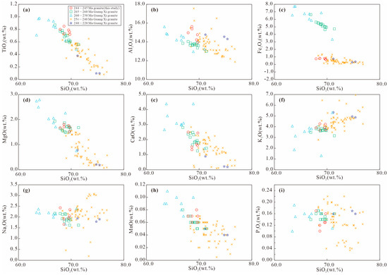 Plots of (a) TiO2, (b) Al2O3, (c) Fe2O3, (d) MgO, (e) CaO, (f) K2O, (g) Na2O, (h) MnO, and (i) P2O5 versus SiO2 in granite from Darongshan–Shiwandashan, southeast Guangxi. Data sources are the same as in Figure 6.