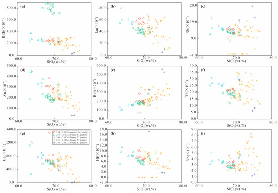 Plots of (a) REE, (b) La, (c) Nb, (d) Zr, (e) Rb, (f) Th, (g) Ba, (h) Hf, and (i) Yb versus SiO2 in granite from Darongshan–Shiwandashan, southeast Guangxi. Data sources are the same as in Figure 6.