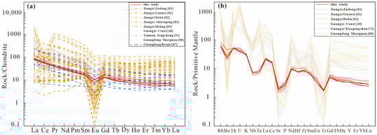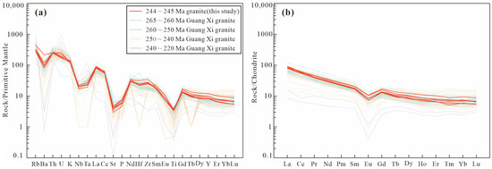 (a) Chondrite-normalized REE distribution patterns and (b) primitive-mantle-normalized multi-element diagrams of granite from Darongshan–Shiwandashan, southeast Guangxi. Data sources are the same as in Figure 6.