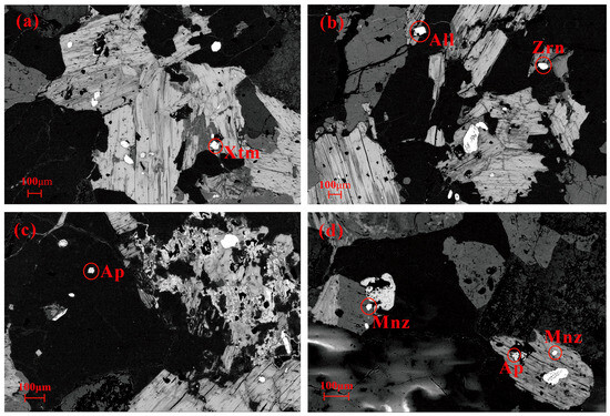SEM images (a–d) of granite from Darongshan–Shiwandashan, southeast Guangxi. Xtm—Xenotime; Ap—Apatite; Mnz—Monazite; Zrn—Zircon; All—Allanite.