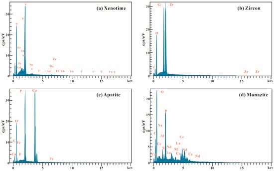 Spectrogram of energy analysis of (a) xenotime, (b) zircon, (c) apatite, and (d) monazite in granite from Darongshan–Shiwandashan, southeast Guangxi.